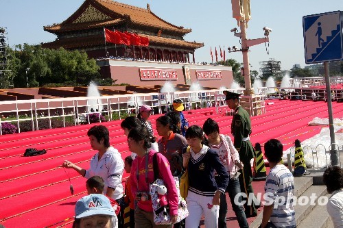 9月21日,国庆将至,北京天安门广场及周围建筑装扮一新,天安门前的临时观礼台已铺上红地毯,到处充溢着节日喜庆氛围。当日,京城天气晴好,天安门前游人格外多。中新社发 胡予芳 摄