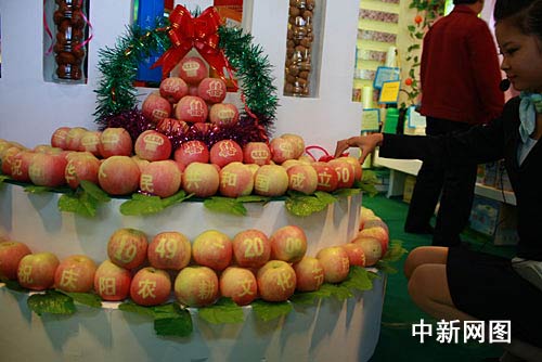 9月21日,中国(庆阳)农耕文化节举行。作为中华民族早期农耕文明的发祥地,甘肃庆阳如今仍是黄河流域农业的重要地区,被称为“陇东粮仓”,此间文化节展厅里瓜果飘香,一幅丰收景象。苹果是该市的特色产业之一,图为精心培育的“欢度国庆”苹果。