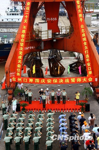 9月21日下午,浙江省台州口岸国庆安保决战誓师大会在椒江海门港码头举行。台州市边检、港务、集装箱公司等单位军警民联合参加,标志着台州口岸国庆安保任务进入决战阶段。图为在台州口岸国庆安保决战誓师大会现场,军警民参加宣誓。中新社发 王天荣 摄