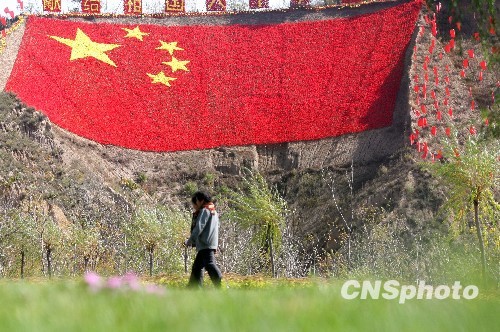 9月23日,黑龙江哈尔滨市道外区天恒山下,人们从由绢花组成的国旗旁走过。据了解,这面巨型五星红旗由5.6万朵绢花组成,旗面长60米、宽40米,是为迎接建国60周年而设立的。中新社发 靖阳 摄