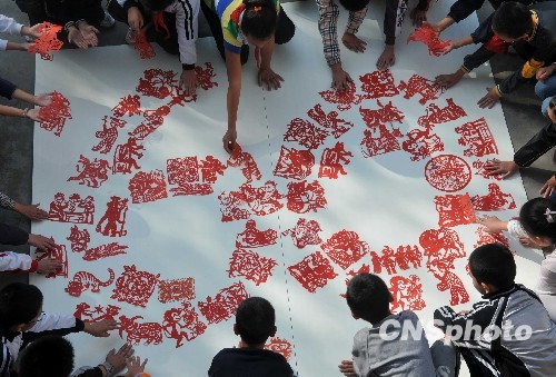 9月23日,在河南洛阳市老城区坛角小学孩子们正在把自己的剪纸作品拼成图案办剪纸板报。为喜庆国庆60周年,坛角小学的孩子们在老师的帮助下把一张张自己的剪纸作品贴在展板上制作国庆剪纸板报,喜迎国庆。中新社发 赵朝军 摄