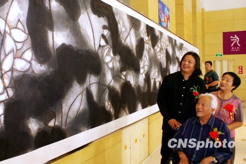 旅美画家孟昌明回乡用半月时间创作的一幅20米长水墨荷花长卷画作,2009年9月23日在江苏响水展出。中新社发 李根 摄