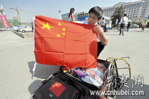 (湖北)浠水农民熊保华心中有一个火红的愿望——走遍中国,将国旗送进千家万户。昨日,记者在汉口火车站见到他,他的旅行箱里装满几十面国旗。