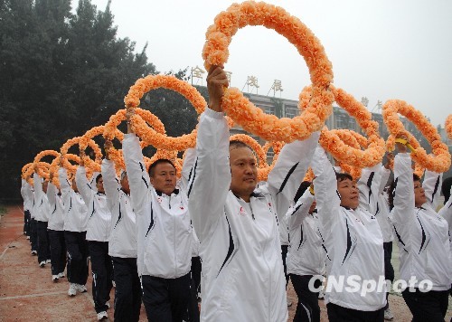 9月25日上午,国庆60周年庆典群众游行“浴血奋斗”方阵中的“共和国同龄人”大队正在认真训练,参演的成员大都是1949年出生。中新社发 侯宇 摄