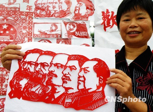 2009年9月25日,湖北宜昌市民间艺人龙长珍、胡文英等在夷陵广场上创作并展出剪纸,迎接即将来临的祖国六十华诞。中新社发 刘君凤 摄