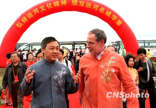 9月26日下午,中国大运河发祥地扬州在大运河畔“京杭之心”举行世界运河名城博览会永久性会址奠基仪式。扬州代市长谢正义(左)与国外运河城市市长交流。中新社发 崔佳明 摄