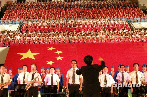 9月26日晚,广西桂林万人齐聚体育馆举行“为祖国喝彩”大型歌会,庆祝中华人民共和国成立六十周年。中新社发 伍章明 摄
