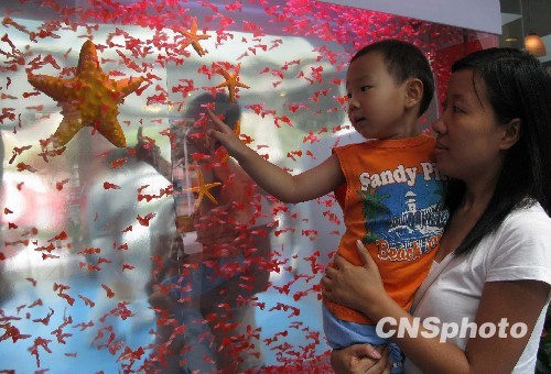 九月二十六日,新中国六十华诞将至,上海海洋水族馆特别设计了国庆特别展缸,五颗黄色海星、两千零九尾鲜红的孔雀鱼组成五星红旗图样,吸引了众多游客。中新社发 陈静 摄