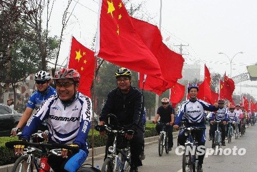 9月27日上午,河北邢台街头国旗飘扬,邢台市“百名青年、百面国旗环城骑行”主题活动隆重举行,此次活动的主题是“迎国庆、讲文明、树新风”,这个市的团员青年以这种方式为中国喝彩,为祖国六十年华诞祝福。中新社发 陈雷(邢台) 摄