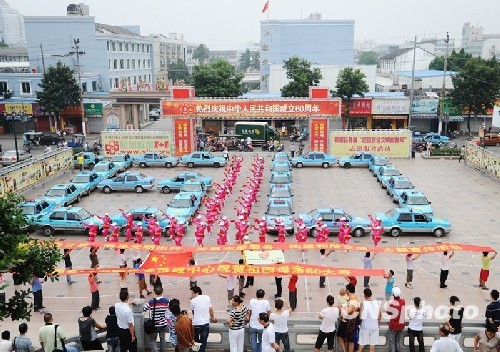 9月27日上午,浙江苍南县举行“迎国庆讲文明树新风”志愿服务活动。活动现场,26辆出租车摆放成“60”字样,50名志愿者手举国庆标语和五星红旗,祝福祖国母亲60大寿。中新社发 李士明 摄