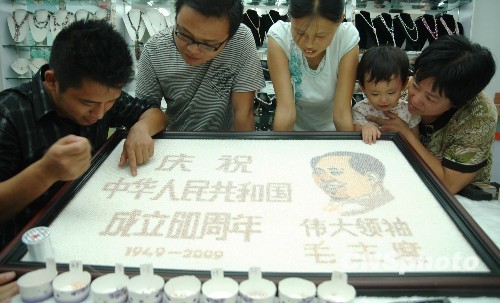 2009年9月27日,一幅长90厘米、宽60厘米,选用16万余颗3毫米以下珍珠制成的“伟大领袖毛主席”作品在苏州相城区渭塘镇的中国珍珠宝石城亮相。该作品是由苏印珠宝行珍珠超人计晓明整整花了100天才制作而成的,表达了他对新中国60华诞的美好祝福。中新社发 苏民 摄