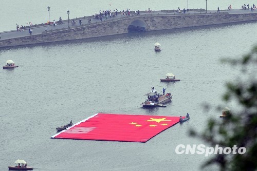 9月28日下午,一面长30米、宽20米的巨幅国旗在浙江杭州西湖白堤锦带桥附近的水面上“升起”,杭州市民以此欢庆新中国成立60周年。 中新社发 李忠 摄
