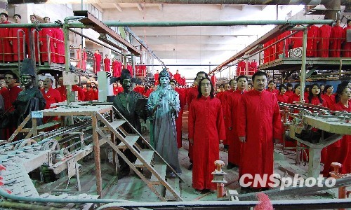 9月28日上午,广东佛山1000名各界人士身穿红袍在行为艺术家舒勇的带领下同唱国歌,以此抒发爱国爱家乡的情怀。中新社发 柯小军 摄