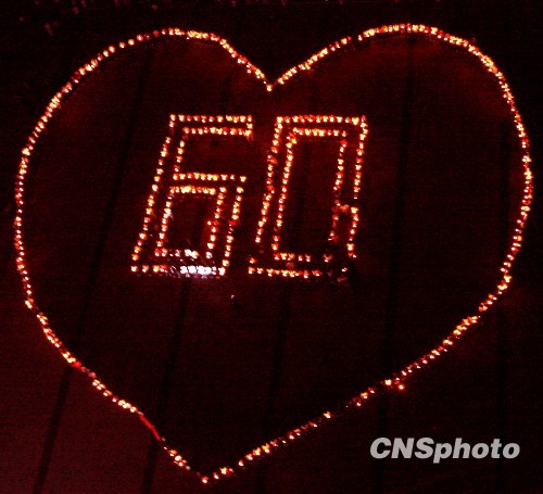 9月27日晚,重庆科创职业学院开展“我和我的祖国”大型主题晚会。晚会上,1000名学生手捧蜡烛,围成一个大红心图案,图案之中组成“60”字样,喜庆新中国成立60周年。中新社发 陈仕川 摄