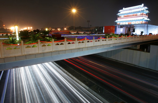 2009年9月28日,竣工的永定门南广场。 当日,京城“空中花园”竣工。夜幕下与永定门城楼遥相呼应。这个占地2.2万平方米,相当于3个足球场大小的“空中”广场凌空横跨在南二环和护城河上方,成为南中轴线上的一座“空中花园”。王珏茜 摄