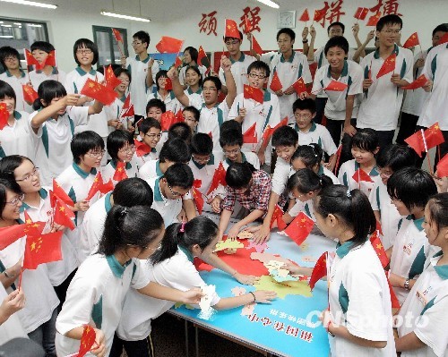 9月29日,绍兴高级中学高一14班的60名师生正在共拼祖国版图。当日,浙江绍兴高级中学上千名师生举行了“祖国在我心中”共庆新中国60岁生日系列活动。随着国庆的临近,人们用各种方式庆祝新中国六十华诞。 中新社发 陈果 摄