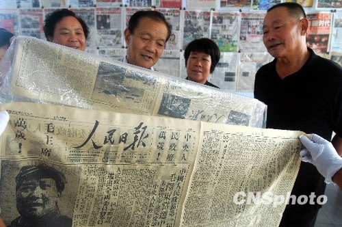9月29日,世界上第一张双面丝绸版《人民日报》在山东郯城展出。当日,山东省郯城县退休教师丁思德举行个人收藏展,展览展出这套《人民日报》采用“丝绸双面印制”工艺纯手工制成。这套1949年10月1日以及10月2日出版的丝绸《人民日报》对开四版,也是唯一一张刊登开国7位正副主席、50位中央人民政府委员相片的报纸。中新社发 房德华 摄