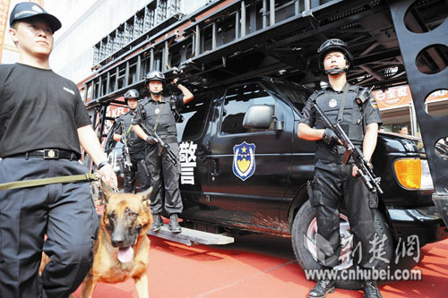 昨日(29日),10余名特警手持冲锋枪、带着警犬与攻坚车在(武汉)江汉路佳丽广场亮相,引起市民围观。