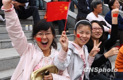 10月1日上午,在黑龙江省鹤岗市振兴广场电视大屏幕前观看国庆阅兵现场转播的几名大学生挥动小国旗,为祖国欢呼:“五星红旗,我为你骄傲!”中新社发 房宝树 摄