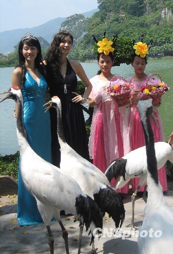 十月二日,第五十八届世界小姐中国赛区季军刘婷婷与广州赛区亚军得主邓雯心和丹顶鹤一道出现在星湖景区,成为景区又一道亮丽的景点。中新社发 黄耀辉 摄