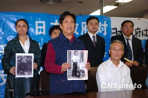 10月5日,来自重庆、成都、乐山三地的十八名重庆大轰炸受害者走上东京地方法院的法庭,要求日本政府谢罪和赔偿。这也是重庆大轰炸对日民间索赔案的第四次起诉、第十一次开庭审理。图为受害者之一的曾宪君在当天举行的记者见面会上手持父母生前照片控诉日军暴行。中新社发 朱沿华 摄