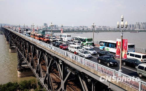 10月7日,随着国庆黄金周接近尾声,返程客流出现高峰,南京长江大桥上车流明显增加。交警部门通过加派警力上路执勤等应对客流高峰,确保车辆及旅客安全文明返程。中新社发 钟山 摄