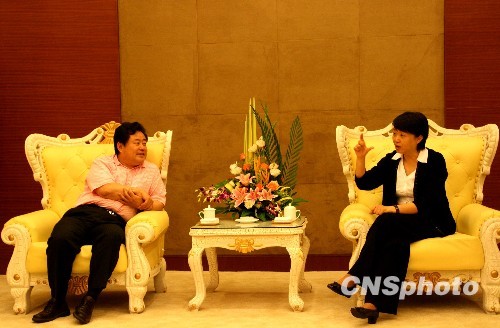10月7日晚,第七届中国音乐金钟奖古筝比赛暨2009中国扬州古筝艺术节在素有“古筝之乡”美誉的扬州鸣钟开赛,从今年开始,四年一届的“金钟奖”古筝比赛落户扬州。图为扬州市委书记王燕文(右)会见中国音协分党组书记徐沛东(左)表示,为古筝艺术的广泛传播与普及,将进一步弘扬民族文化,推动我国古筝艺术的发展同时,彰显扬州“古筝之乡”文化特色。中新社发 崔佳明 摄