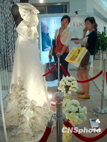 10月10日,一件价值高达250万元人民币的全球最昂贵铂金婚纱在苏州观前街的一家商场亮相,吸引了不少顾客驻足观看。该件婚纱以牡丹为创意元素,用铂金进行装饰,由国际铂金协会邀请世界著名设计师VivienneTan经过近一年时间创作完成的。中新社发 王建康 摄