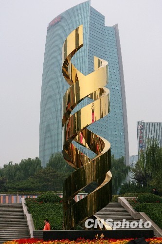 10月12日,重新制作的的中关村标志——金色双螺旋雕塑《生命》落成亮相。金黄色的中关村“双螺旋”雕塑是在1992年矗立在中关村大街的路中央的,DNA双螺旋结构是1953年由两位年轻的英国生物学家沃森和克里克发现的,科学家勇于挑战权威及严肃认真的科学精神和品质正是中关村所倡导的,也符合科技社区的文化意义。中新社发 苏丹 摄