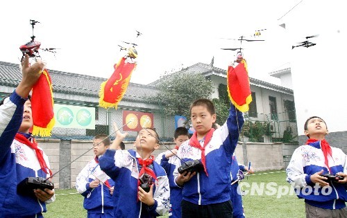 2009年10月13日,苏州市百年老校--草桥小学在操场举行庄严而又隆重的庆祝中国少先队建队六十周年升国旗、唱队歌、红旗下宣誓及新队员入队仪式后,名为“祝福祖国 放飞希望”的少先队主题活动热闹开场。 该校60名航模兴趣小组选手随着全校师生嘹亮的中国少年先锋队队歌声响起,将手中的60架飘挂少先队旗的模型飞机齐放蓝天,表达姑苏少年对少先队生日的良好祝愿和美好祖国的衷心祝福。中新社发 王建中 摄