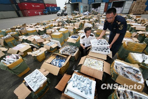 10月14日,广州海关查获15万只侵权手表,数量之多国内罕见,成为广州海关近年来查获侵权手表数量最多的一起案件。中新社发 刘从新 摄