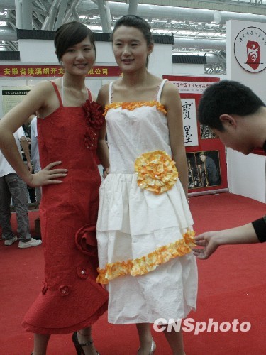 10月16日,第三届全国文化纪念品博览会在安徽合肥国际会展中心拉开帷幕。图为用彩色宣纸做成的“宣纸时装秀”引人注目。中新社发 韩苏原 摄