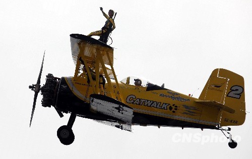 二00九中国国际通用航空大会十月十七日在陕西省的西安和渭南两地开幕,这是中国首次设立的国家级通用航空专业特色会展。来自海外的近三十家通用航空企业和中国上百家企业参展。图为瑞典飞行表演队的美女在展示机翼行走。中新社发 冽玮 摄
