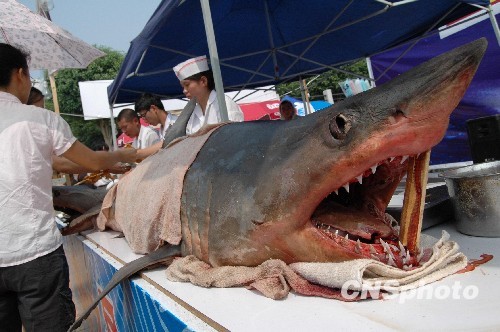 10月18日,在广西南宁举行的东南亚国际旅游美食节分会场上,商家推出“鲨鱼宴”,现场宰杀并烧烤鲨鱼以飨食客。中新社发 王刚 摄