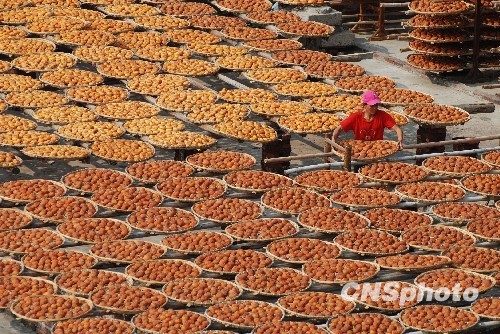 10月中旬,广西恭城县莲花镇龙田村瑶胞在晾晒月柿。金秋时节,中国月柿之乡——广西恭城瑶族自治县16万亩月柿喜获丰收。阳光下,农民家的房前屋后和楼顶遍地金黄,到处是丰收景象。中新社发 喻湘泉 摄