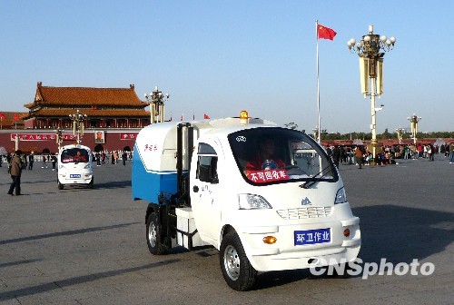 10月20日,两辆新型纯电动保洁车亮相北京天安门广场试运行。据工作人员介绍,这款新型绿色保洁车将于近期正式在天安门广场投入使用。 中新社发 玉龙 摄