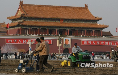 10月21日,工人在天安门广场上驾驶拖拉机翻耕草坪用地。当日,绿化工作人员为天安门广场上国庆期间摆放彩车的地表进行修整,准备重新铺设草坪。中新社发 苏丹 摄