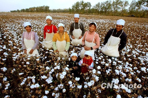 近日,来自河北邯郸市魏县的王建(左三)与妻子、儿子、儿媳、孙子,一家八口近日在新疆生产建设兵团农二师30团棉田中拍摄全家福。王建已连续10年来该团采摘棉花,如今成为采棉经纪人,今年就带领150多名乡亲来该团采摘棉花。据新疆维吾尔自治区统计局介绍,今年新疆的棉花种植面积达2015.6万亩,较上年下降19.4%,预计棉花总产量237.46万吨,同比下降21.3%。新疆是中国产棉大区,多年来棉花种植面积占到全国的三分之一。在去年服装纺织品出口受阻、棉花需求持续疲软的情形下,今年新疆进一步缩减棉田面积,为效益更好的其他经济作物和粮食生产“让路”。中新社发 刘新 摄