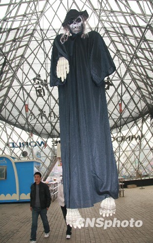 10月28日,离西方传统“鬼节”万圣节还有几天,但内陆城市长沙街头的诡异气氛早已弥漫开来,高悬的僵尸、面目狰狞的电锯狂人、尖锐犀利的疯狂护士,风格迥异的“小鬼”扎堆在长沙世界之窗公园入口,恐怖氛围相当浓厚。中新社发 肖前辉 摄