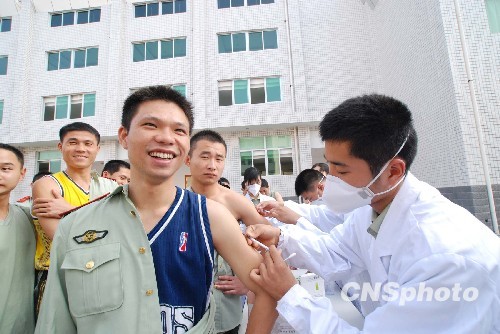 10月28日,武警福建总队直属支队汽车运输中队的战士正在接种甲型H1N1流感疫苗。当日,担负处置急、难、险、重任务的武警福建总队直属支队官兵成为福建首批开展接种甲型H1N1流感疫苗的武警官兵。中新社发 曾朝群 摄