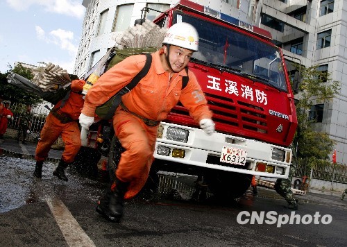 10月28日,云南省公安消防部队举行2009年度特全省勤队伍集中大比武活动,来自省内的12支特勤中队共120人参加,比武内容有理论考核,合力营救操,深井救人操,内攻侦检、救人、转移危险品灭火操等,以考验消防官兵的业务素质。练兵比武活动是提升消防队伍岗位技术水平、增强队伍综合素质的有效途径。图为消防队员在进行合力营救操比赛。中新社发 刘冉阳 摄