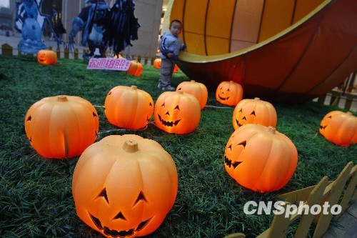 10月28日晚,北京新世界商场门口摆放着滑稽可爱的“恐怖南瓜”,吸引不少孩子合影留念。中新社发 郑雄增 摄