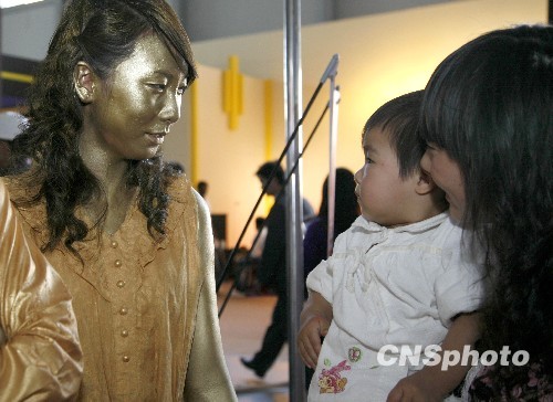 10月28日,2009昆明秋季房产交易会在昆明国际会展中心举行,许多房产开发商推出了各种花样吸引购房者。图为房交会上的活体雕塑吸引一名小观众的目光。中新社发 刘冉阳 摄