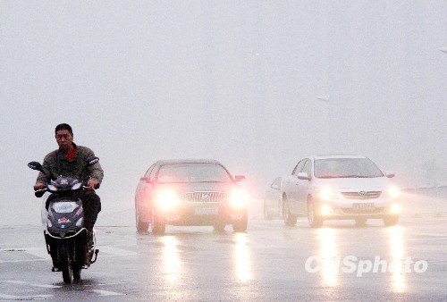 10月30日清晨,南京遭遇大雾天气,能见度低,给市民出行带来不便。中新社发 钟山 摄