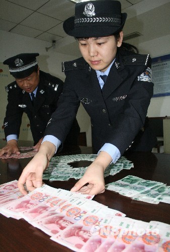 10月31日,山东博兴县警方一次性收缴到各种面额假币共计30000多元,其中包括“同号假币”9000元,其中包括面值100元的同号假币30张(AB11872559),面值50元的同号假币120张(FA74922338)。中新社发 陈 彬 摄