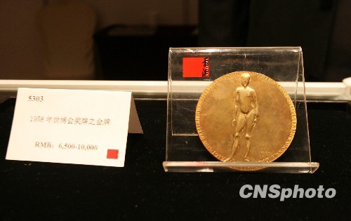 11月1日,河南郑州,一枚1958年世博会金牌现身于为期三天的“中国嘉德二00九秋季拍卖会”郑州巡展上。当日,记者从中国嘉德国际拍卖有限公司获悉,该奖牌将于中国嘉德09秋季拍卖会上被拍卖。中新社发 王中举 摄