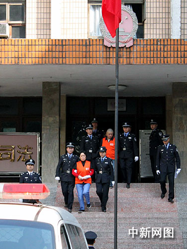 中新网重庆11月3日电( 银雪)重庆抓获的十九个涉黑团伙中唯一女首犯谢才萍3日上午一审宣判:谢才萍被控的组织、领导黑社会性质组织罪、开设赌场罪、非法拘禁罪、容留他人吸毒罪、行贿罪五宗罪成立,被判有期徒刑18年,并处罚金102万元人民币。图为判决后谢才萍走出法庭。