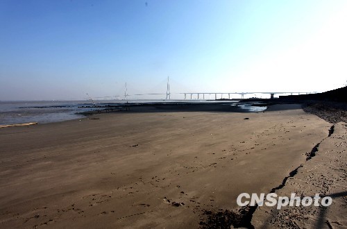 11月3日,江苏常熟黄通大桥一侧江滩凸显,水位下降。目前,苏通大桥水域已进入枯水期,水位呈下降趋势。为此,常熟海事处加大桥区水域海巡艇巡逻频率,提醒过往船舶密切关注苏通大桥水域水位变化,及时调整货物配载,防止搁浅事故发生。中新社发 王必春 摄