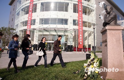 11月3日下午,中国目前最具实力的空间技术及其产品研制基地、人造卫星和神舟飞船的“摇篮”——中国空间技术研究院在北京航天城举行仪式,深切缅怀该院老院长、“中国航天之父”钱学森。正在中国空间技术研究院就读研究生的航天青年学子们面朝钱学森塑像列队肃立默哀一分钟,向钱老塑像敬献花篮,随后依次手持黄、白菊花敬献钱老塑像并鞠躬致敬。中新社发 孙自法 摄