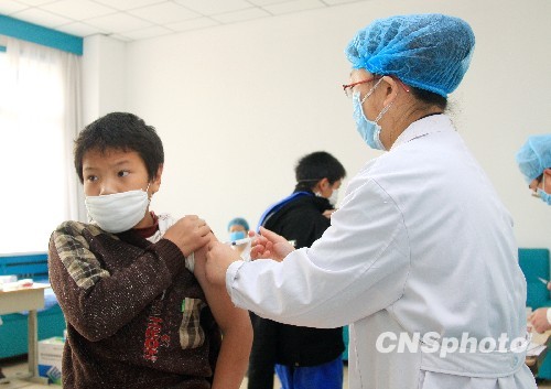 11月4日,辽宁省辽阳市第一中学西藏班的学生开始接受甲型H1N1流感疫苗接种,这些来自雪域高原的学生被列入该市优先接种人群,700多名学生分2批接种。中新社发 曹精义 摄